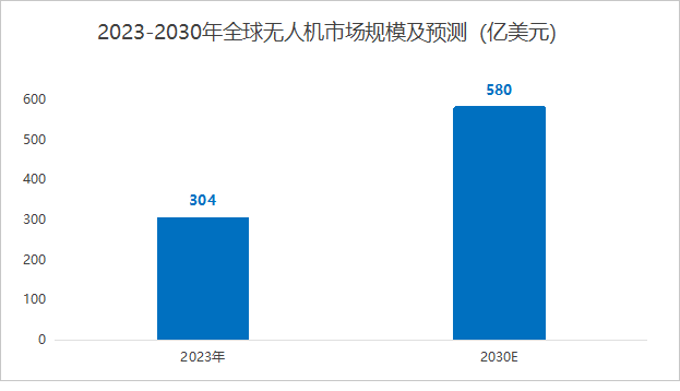 作為低空經(jīng)濟的重要細分領(lǐng)域,無人機近年來發(fā)展迅猛。預(yù)計2023到2030年,全球無人機市場規(guī)模將從304億美元增長至580億美元。