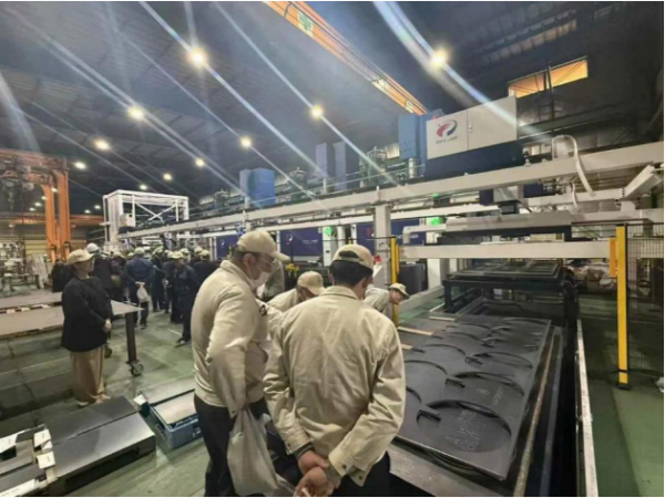 該發(fā)布會在日本大松機(jī)械公司舉行。該公司是一家大型機(jī)械零部件制造公司,擁有8臺通快激光切割機(jī)和6臺奔騰激光切割機(jī)。今年初安裝了一套奔騰激光研發(fā)設(shè)計的一拖三(12kw激光)全自動化切割下料產(chǎn)線,每天24小時連續(xù)運(yùn)行了2個月時間。其性能穩(wěn)定,客戶生產(chǎn)效率得到極大提升。參會人員興致勃勃地參觀了這條自動化產(chǎn)線的生產(chǎn)演示,給予了高度評價。
