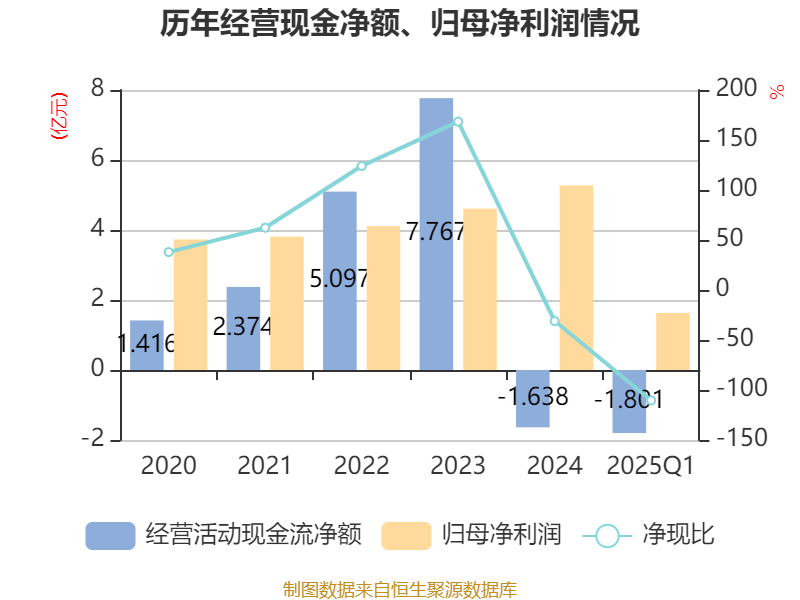 截至2025年一季度末,公司經(jīng)營(yíng)活動(dòng)現(xiàn)金流凈額為-1.8億元,同比減少1.49億元;籌資活動(dòng)現(xiàn)金流凈額2720.73萬(wàn)元,同比增加7807.55萬(wàn)元;投資活動(dòng)現(xiàn)金流凈額-3867.18萬(wàn)元,上年同期為-656.33萬(wàn)元。