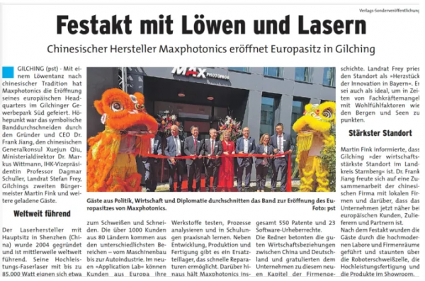典禮現(xiàn)場(chǎng)可謂高朋滿座:中國(guó)駐慕尼黑總領(lǐng)事邱學(xué)軍先生、巴伐利亞州經(jīng)濟(jì)、區(qū)域發(fā)展與能源部部長(zhǎng)Wittmann博士、施塔恩貝格(Starnberg)首席行政長(zhǎng)官M(fèi)r.Frey、吉爾興市長(zhǎng)Mr. Fink、巴伐利亞工商會(huì)副主席Schuller教授親臨現(xiàn)場(chǎng)并熱情致辭,巴伐利亞投資局副局長(zhǎng) Mrs.Hoffmann,以及來自全球激光產(chǎn)業(yè)鏈的三十余位國(guó)際知名企業(yè)CEO、CTO,本地各界知名人士親臨現(xiàn)場(chǎng)表達(dá)支持,一起共同見證中國(guó)激光品牌在歐洲腹地扎根的重要里程碑。