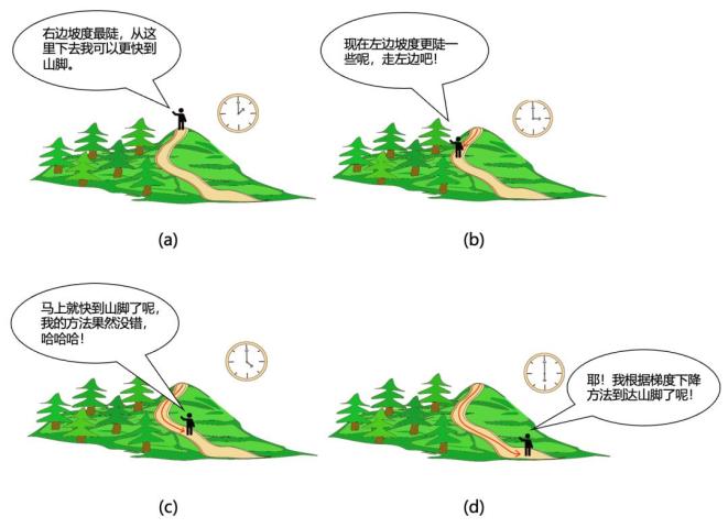 下山時(shí),你需要通過當(dāng)前的坡度來決定下坡的方向。通常的方案是,你沿著坡度下降的方向不斷前進(jìn),每次都朝著最陡的方向走,才會(huì)快速接近山谷(圖 3)。