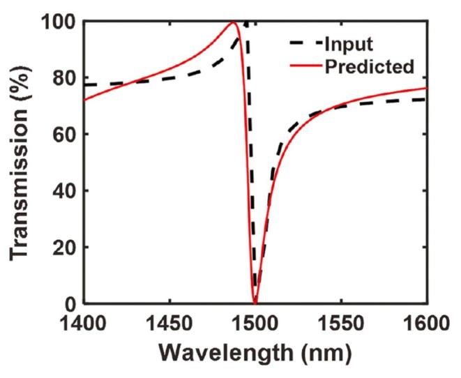 圖 7:輸入透射光譜(黑色虛線)和神經(jīng)網(wǎng)絡(luò)模型預(yù)測(cè)結(jié)構(gòu)的透射光譜(紅色實(shí)線)比較[5]