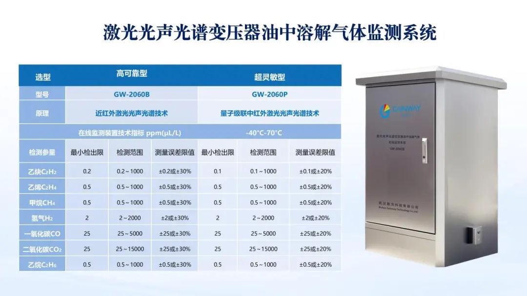 變壓器油中溶解氣體在線監(jiān)測技術是實施主變壓器狀態(tài)監(jiān)測的重要手段,其技術關鍵是根據(jù)光譜技術分析油中特征氣體成分的變化,根據(jù)監(jiān)測結果來分析判斷電力變壓器內部的異常和故障發(fā)展趨勢,以保證電力變壓器的安全可靠運行。GW-2060型激光光聲光譜變壓器油中氣體監(jiān)測預警裝置是基于先進的中紅外量子級聯(lián)激光光聲光譜技術面向國家電網(wǎng)及能源安全研制的高可靠性變壓器油中溶解氣體檢測系統(tǒng),可實現(xiàn)變壓器油中溶解的H2、CO、CO2、CH4、C2H2、C2H4、C2H6等故障氣體及微水含量的連續(xù)在線檢測,為變壓器提供全面的實時監(jiān)測預警。