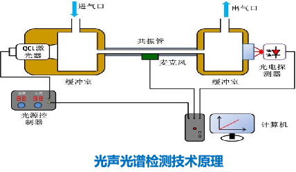 基于中紅外量子級聯(lián)激光光聲光譜檢測技術,運用中紅外波段的高吸收系數(shù)特點,選擇中紅外量子級聯(lián)激光器(QCL)作為光源,提高最低檢測限和系統(tǒng)測量精度。當光聲腔內樣品受到一束調制后的單色光照射時,以無輻射弛豫方式將吸收的光能部分或全部地轉換成熱,樣品受熱體積膨脹,產(chǎn)生以光源為中心向外擴展的壓力波,用置于其中的聲波傳感器便可接收到聲音(光聲)信號。