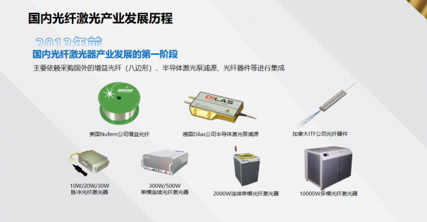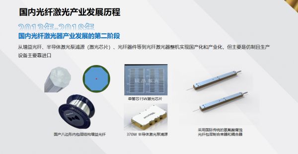 2013年起,國內(nèi)光纖激光器件產(chǎn)業(yè)逐步發(fā)展,增益光纖、半導(dǎo)體激光泵浦源、激光芯片、合束器、隔離器等關(guān)鍵部件陸續(xù)實(shí)現(xiàn)國產(chǎn)化,推動(dòng)了光纖激光器整機(jī)的量產(chǎn)。在部分功率段的激光單品上,國產(chǎn)激光器開始具備與進(jìn)口產(chǎn)品競(jìng)爭(zhēng)的能力。不過,這一階段的國產(chǎn)器件仍以仿制為主,生產(chǎn)設(shè)備也多數(shù)依賴進(jìn)口。