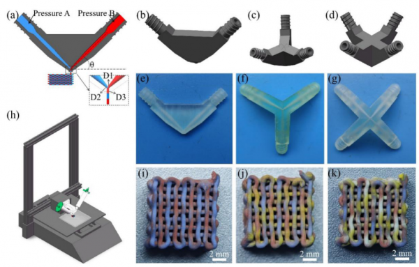 研究團(tuán)隊(duì)自主設(shè)計(jì)并制備了新型多流道匯聚噴頭,將其集成于3D打印設(shè)備后,成功實(shí)現(xiàn)了2種、3種及4種陶瓷漿料復(fù)合支架的精準(zhǔn)3D打印成型。該結(jié)果充分驗(yàn)證了所提集成方案的可行性——通過創(chuàng)新噴嘴結(jié)構(gòu)、定制化直接墨水書寫系統(tǒng)與優(yōu)化工藝參數(shù)的協(xié)同配合,有效突破了多組分陶瓷復(fù)雜結(jié)構(gòu)的增材制造瓶頸。