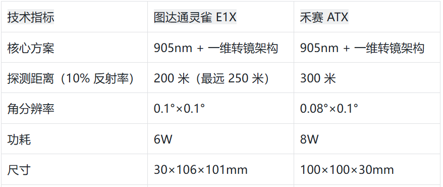 值得注意的是,靈雀E1X作為圖達(dá)通首款905nm量產(chǎn)機(jī)型,其6W低功耗、3600元成本控制等優(yōu)勢(shì),與其此前1550nm產(chǎn)品相比實(shí)現(xiàn)顯著突破,而這些技術(shù)特性恰與禾賽AT系列的核心競(jìng)爭(zhēng)力高度吻合。
