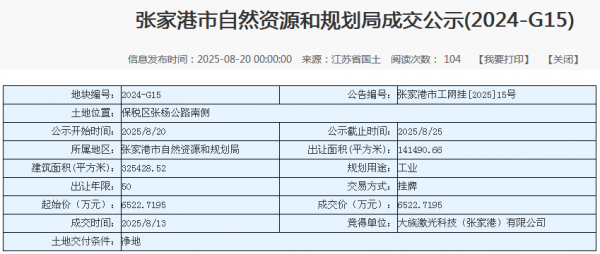 作為激光行業(yè)龍頭企業(yè),大族激光的每一步布局都牽動(dòng)行業(yè)神經(jīng)。2025年8月,大族激光科技(張家港)有限公司以6522.7195萬(wàn)元競(jìng)得張家港市保稅區(qū)141490.66平方米工業(yè)用地,為其華東區(qū)域產(chǎn)能擴(kuò)充落下關(guān)鍵一子。該地塊采用江蘇首創(chuàng)的“標(biāo)準(zhǔn)地+雙信地+定制地”出讓模式,政府提供“三凈地”保障,實(shí)現(xiàn)“成交即發(fā)證、交地即開(kāi)工”,企業(yè)則承諾固定資產(chǎn)投資強(qiáng)度不低于802萬(wàn)元/畝,彰顯政企協(xié)同發(fā)展的高效性。