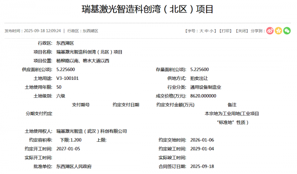武漢作為“中國(guó)光谷”所在地,始終是激光產(chǎn)業(yè)的戰(zhàn)略高地。2025年9月,瑞基激光智造(武漢)科創(chuàng)有限公司以8620萬(wàn)元拿下東西湖區(qū)5.2256公頃土地,啟動(dòng)總投資17億元的科創(chuàng)灣(北區(qū))項(xiàng)目,計(jì)劃2027年開(kāi)工、2029年竣工,打造激光產(chǎn)業(yè)創(chuàng)新生態(tài)綜合體。