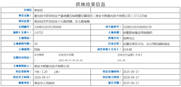 在激光產(chǎn)業(yè)高端化進(jìn)程中,核心部件與精密測(cè)量技術(shù)的突破成為關(guān)鍵。2025年6月,淮安卡斯激光技術(shù)有限公司以618.88萬(wàn)元競(jìng)得淮安經(jīng)濟(jì)開(kāi)發(fā)區(qū)37.13畝土地,啟動(dòng)激光技術(shù)研發(fā)和生產(chǎn)基地暨五軸測(cè)量?jī)x器項(xiàng)目,將于2026年開(kāi)工、2028年竣工,專注激光核心技術(shù)攻堅(jiān)。