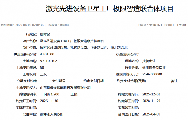 2025年4月,山東鋼豪發(fā)智能科技發(fā)展有限公司以2146萬(wàn)元拿下淄博周村區(qū)4.4013公頃土地,投資2.8億元建設(shè)激光先進(jìn)設(shè)備衛(wèi)星廠極限智造聯(lián)合體項(xiàng)目,計(jì)劃2026年開(kāi)工、2028年竣工,聚焦光纖激光切割機(jī)量產(chǎn)。