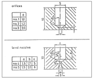 目前激光切割用的噴嘴采用簡單的結(jié)構(gòu),即一錐形孔帶端部小圓孔。通常用實驗和誤差方法進行設(shè)計。由于噴嘴一般用紫銅制造,體積較小,是易損零件,需經(jīng)常更換,因此不進行流體力學計算與分析。在使用時從噴嘴側(cè)面通入一定壓力Pn(表壓為Pg)的氣體,稱噴嘴壓力,從噴嘴出口噴出,經(jīng)一定距離到達工件表面,其壓力稱切割壓力Pc,最后氣體膨脹到大氣壓力Pa。研究工作表明隨著Pn的增加,氣流流速增加,Pc也不斷增加??捎孟铝泄接嬎悖?/font>