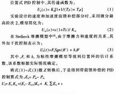 通過大量實(shí)驗(yàn),對(duì)系統(tǒng)進(jìn)行分析后發(fā)現(xiàn):對(duì)位置偏差控制采用PID控制方法可以提高精度和階躍響應(yīng);加入速度和加速度前饋補(bǔ)償控制方法可以提高系統(tǒng)的穩(wěn)態(tài)精度;加入摩擦補(bǔ)償可以克服摩擦力的影響。因此,此方案沒計(jì)是一種既利用位置誤差進(jìn)行閉環(huán)控制,又利用給定位置信號(hào)進(jìn)行開環(huán)的復(fù)合控制系統(tǒng)。