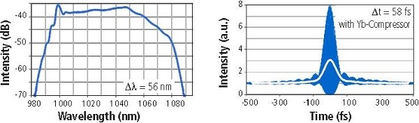我們以Menlosystems公司摻Yb光纖激光器(中心波長1030nm)很為例,在鎖模狀態(tài)下,擁有56nm的寬光譜(FWHM)和58fs的脈沖寬度。這使其將獲得更強(qiáng)的色散和非線性效應(yīng),從而通過非線性光纖能夠獲得更大的光譜展寬。