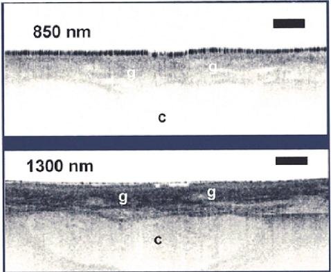 第一,人體細(xì)胞對(duì)850nm以下的光,有較強(qiáng)的散射,而細(xì)胞中的水份對(duì)1500nm以上的光,吸收率又較高,這兩點(diǎn)都對(duì)OCT的應(yīng)用極其不利,因此,通常OCT的光源都要求波長在850-1600nm之間。圖3分別顯示了850nm1300nm下的喉部軟骨組織OCT影像。1300nm下的圖象明顯更清晰。#p#分頁標(biāo)題#e#