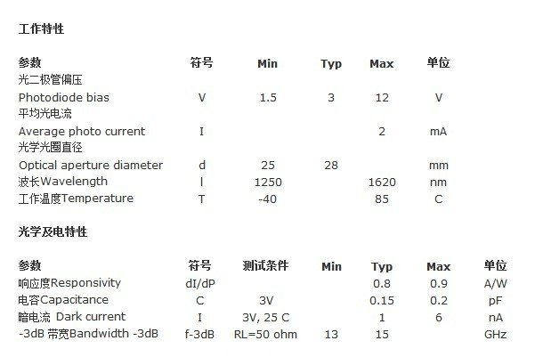該型InGaAs PIN 光探測器芯片是針對12.7Gb/s數(shù)率光傳輸應(yīng)用的寬帶器件。配合使用低噪轉(zhuǎn)阻放大器(TIA),其特征10Gb/s敏感性好于-19dBm。正面照射的芯片設(shè)計保證了低暗電流及高可靠性。該芯片產(chǎn)品通過了Telcordia GR-468 CORE資格認證。