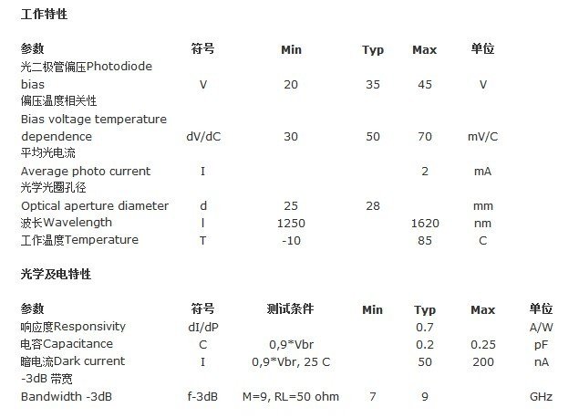 該型InGaAs APD 光探測(cè)器芯片是針對(duì)10.7Gb/s數(shù)率光傳輸應(yīng)用的寬帶器件。配合使用低噪轉(zhuǎn)阻放大器(TIA),其特征10Gb/s敏感性好于-26dBm。正面照射的芯片設(shè)計(jì)保證了低暗電流及高可靠性。該芯片產(chǎn)品通過了Telcordia GR-468 CORE資格認(rèn)證。