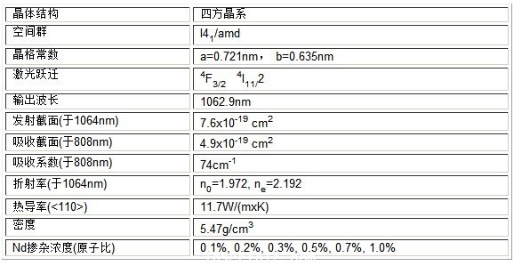 摻釹釩酸釓晶體(Nd:GdVO4)是和摻釹釩酸釔單晶(Nd:YVO4)性質(zhì)相近的優(yōu)秀的激光晶體,具有優(yōu)良的物理、光學(xué)、機(jī)械性能,是理想的激光二極管泵浦全固態(tài)(DPSS)微小型激光器的激光工作物質(zhì)之一。它比Nd:YAG有更高的斜率效率,比釩酸釔有更好的熱導(dǎo)和高輸出功率,故在高功率DPSS場合,使用Nd:GdVO4的效果會(huì)比使用Nd:YAG和Nd:YVO4更好。