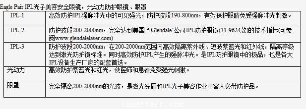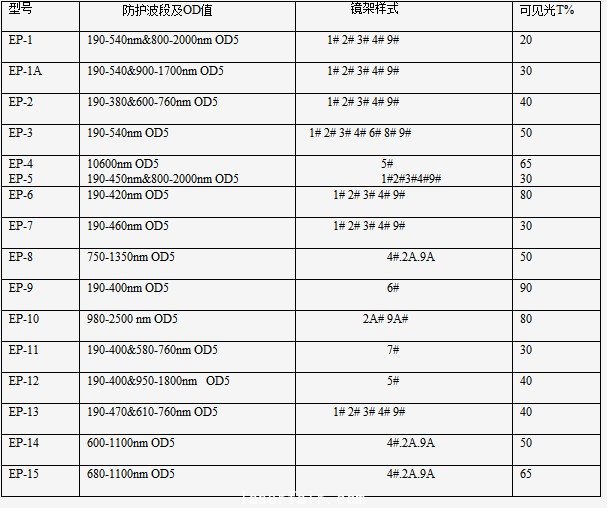 Eagle Pair寬光譜連續(xù)吸收式激光防護(hù)鏡技術(shù)參數(shù)及鏡架樣式表