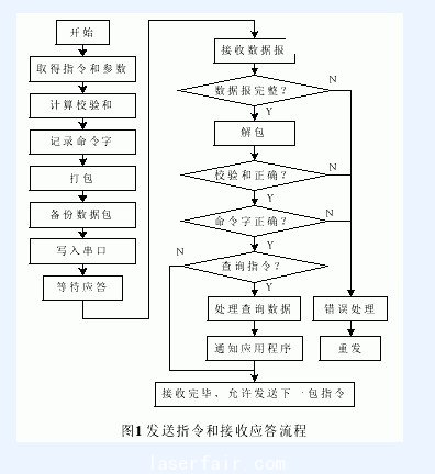 (5)應(yīng)答方式。在通信過程,下位機對上位機每一幀數(shù)據(jù)都必須做出的應(yīng)答。上位機根據(jù)返回的應(yīng)答判斷通信狀態(tài),然后進行下一步動作。為了安全起見,規(guī)定只有在確認(rèn)前一包指令正確應(yīng)答之后,才可以發(fā)下一包指令。對于非查詢指令(包括全部解釋執(zhí)行指令和部分立即執(zhí)行指令),下位機收到后,返回該指令的命令字;對于查詢指令,除了返回命令字之外,同時還返回查詢數(shù)據(jù),如機器人的位置、各軸轉(zhuǎn)角等。如果下位機檢測到數(shù)據(jù)幀有問題,如無幀頭、校驗和錯等,則返回相應(yīng)的錯誤碼。上位機在發(fā)送指令的時候,同時記錄下了該指令的命令字。在接收到下位機返回的應(yīng)答后,將其中的命令字與保留的命令字比較,如果一樣,則說明發(fā)送正確,可以發(fā)送下一條指令;反之,則說明指令發(fā)送有問題,根據(jù)錯誤碼進行錯誤處理,并重發(fā)當(dāng)前指令包。指令的發(fā)送和應(yīng)答的接收過程如圖1所示。