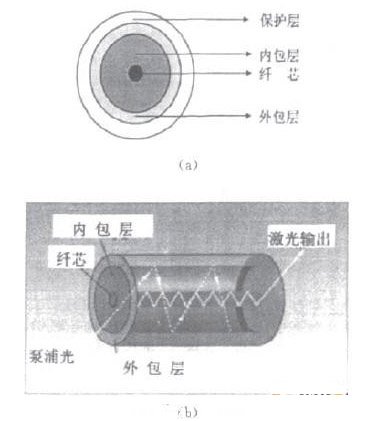 圖1是雙包層光纖截面結(jié)構(gòu)及其工作原理圖。從圖1(a)雙包層光纖的截面結(jié)構(gòu)町見(jiàn),光纖包括四個(gè)部分:纖芯、內(nèi)包層、外包層、保護(hù)層。用分別表示雙包層光纖的纖芯、內(nèi)包層、外包層和保護(hù)層的折射率,則折射率應(yīng)滿(mǎn)足:。