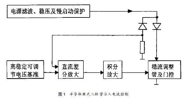 半導(dǎo)體激光二極管工作電流( 注入電流) 調(diào)節(jié)與穩(wěn)流控制基本原理如圖1 所示。該電路采用可調(diào)節(jié)基準(zhǔn)電壓與激光管輸出功率( 與輸出波長相對(duì)應(yīng)) 的反饋電壓相比較來實(shí)現(xiàn)激光管工作電流的調(diào)節(jié)與穩(wěn)流。高穩(wěn)定可調(diào)節(jié)基準(zhǔn)電壓由精密電壓基準(zhǔn)LM399 經(jīng)線繞多圈電位器粗/ 細(xì)調(diào)提供; 反饋電壓則取自由激光管內(nèi)置光電二極管輸出的功率監(jiān)測(cè)電流流經(jīng)取樣電阻上的壓降。此兩路電壓信號(hào)分別輸入至直流差分放大及積分放大, 然后控制穩(wěn)流調(diào)整管的門。由該門調(diào)整連續(xù)流經(jīng)激光管上的電流。對(duì)光源工作波長的掃描與調(diào)制一般是采用對(duì)激光管工作電流進(jìn)行掃描和調(diào)制。因此, 在該注入電流穩(wěn)定的積分放大部分設(shè)有掃描和調(diào)制信號(hào)的輸入。