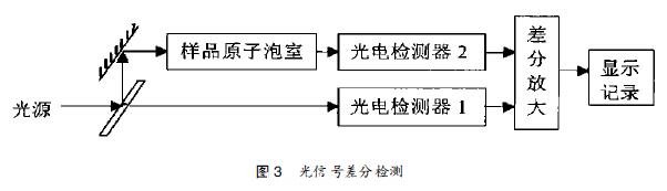 對(duì)光信號(hào)的差分檢測(cè)采用圖3 所示的方式。將由光源出射的光分為兩束, 一束直接進(jìn)入光電檢測(cè)器1; 另一事則經(jīng)過待探測(cè)的原子泡室后再進(jìn)入光電檢測(cè)器2, 所得兩路光電信號(hào)分別輸入到差分放大器, 適當(dāng)調(diào)節(jié)兩組信號(hào)的強(qiáng)度比例, 則基本可去除四對(duì)激光管工作電流掃描引起的輸出信號(hào)上的傾斜功率背景。