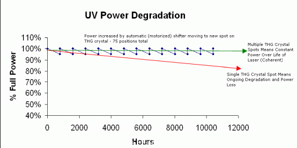 功率隨時(shí)間變化保持恒定 – 隨著工作時(shí)間推移,三倍頻(倍頻)晶體逐漸在出光過(guò)程中退化,最后導(dǎo)致紫外光功率下降。AVIA 使用一塊大體積多點(diǎn)位置設(shè)計(jì)的三倍頻晶體和晶體換位器來(lái)解決這個(gè)問(wèn)題,通過(guò)自動(dòng)移動(dòng)THG晶體,輸出功率恢復(fù)到出廠水平。所有的AVIA激光器都提供一個(gè)至少75個(gè)點(diǎn)位THG晶體,與其它同類的只具有一個(gè)點(diǎn)位的產(chǎn)品相比優(yōu)勢(shì)不言而喻。如下圖所示,紫外線功率恢復(fù)到最初出廠時(shí)的指標(biāo)。