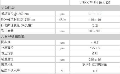 LIEKKI Er110-4/125 光纖是高摻餌濃度光纖,適用于光纖激光器。高摻餌濃度減少了應(yīng)用光纖的長(zhǎng)度,同時(shí)具有很強(qiáng)的增益并減少了非線性效應(yīng)。 特性: 餌離子峰值吸收和光譜...