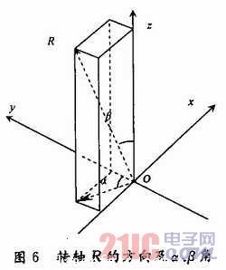 有了轉(zhuǎn)臺(tái)中心軸線的方向,還需要確定空間三點(diǎn)P1,P2,P3繞轉(zhuǎn)軸R形成圓的圓心O”(x0,y0,z0)才能使轉(zhuǎn)臺(tái)中心軸線定位。如圖6,為了求O“,首先計(jì)算轉(zhuǎn)軸R在xOy面上的投影與y軸夾角α、R與z軸的夾角β,然后P1,P2,P3依次繞z軸、x軸旋轉(zhuǎn)到與xOy平行的平面上,旋轉(zhuǎn)矩陣分別為: