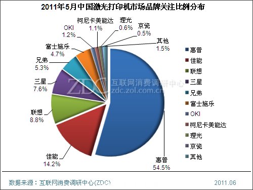 2011年5月的激光打印機市場中,聯(lián)想超過了三星,躋身品牌排行榜三甲。主流品牌關(guān)注度小幅度走低,排名靠后的品牌有了更多的機會,整體市場競爭激烈?;ヂ?lián)網(wǎng)消費調(diào)研中心ZDC根據(jù)激光打印機市場的關(guān)注數(shù)據(jù)推出《2011年5月中國激光打印機市場分析報告》。