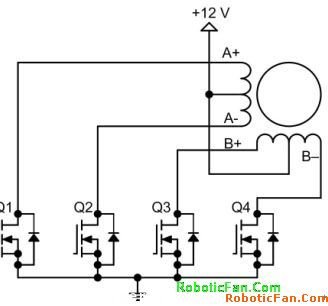 雙極性步進電機的驅(qū)動電路則如圖2所示,它會使用八顆晶體管來驅(qū)動兩組相位。雙極性驅(qū)動電路可以同時驅(qū)動四線式或六線式步進電機,雖然四線式電機只能使用雙極性驅(qū)動電路,它卻能大幅降低量產(chǎn)型應用的成本。雙極性步進電機驅(qū)動電路的晶體管數(shù)目是單極性驅(qū)動電路的兩倍,其中四顆下端晶體管通常是由微控制器直接驅(qū)動,上端晶體管則需要成本較高的上端驅(qū)動電路。雙極性驅(qū)動電路的晶體管只需承受電機電壓,所以它不像單極性驅(qū)動電路一樣需要箝位電路。