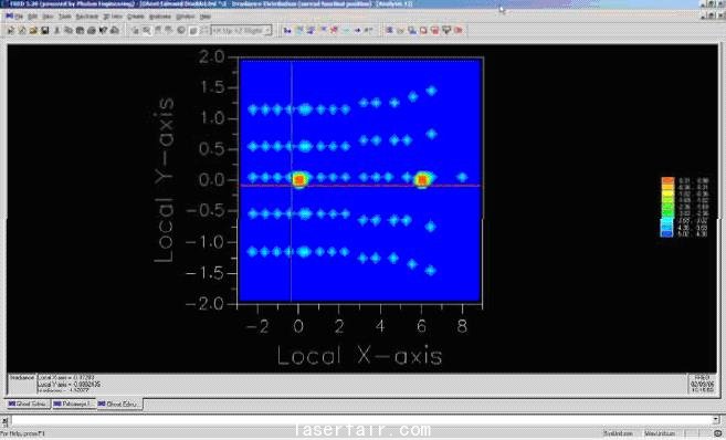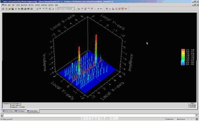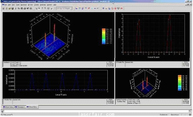 FRED 以四色的面板呈現(xiàn)輻照度圖。左上方是一個(gè)等大的偽彩色圖,它顯示的是在選中分析面上單元功率。 右邊的刻度顯示的是這個(gè)圖中的功率等級(jí)。 右上和左下的面板是左上面...