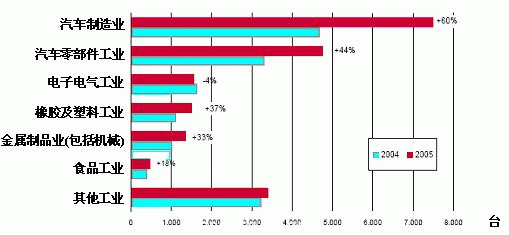圖5: 2004-2005年美洲地區(qū)各主要行業(yè)對工業(yè)機器人需求情況變化圖
