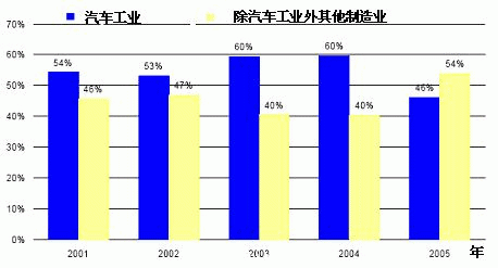圖3: 2001-2005年歐洲地區(qū)汽車工業(yè)對工業(yè)機器人需求占所有工業(yè)對工業(yè)機器人需求比例變化圖