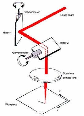 一束激光被兩片掃描振鏡反射,并且通過一片聚焦鏡。振鏡片在一個galvo-掃描器馬達(dá)的帶動下高速的來回延軸旋轉(zhuǎn)。在大多數(shù)情況下,最高偏轉(zhuǎn)角鏡是+12.5°(+10°往往是一個較安全范圍)入射角不能偏于45°。