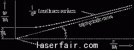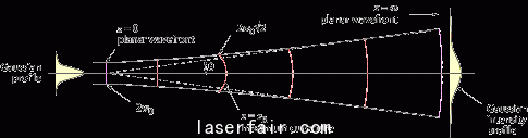 即使一個(gè)高斯TEM(橫模和縱模為0)激光光束波陣面在某個(gè)平面可以保持非常的平坦,它也需要彎曲并且通過如下的公式傳播