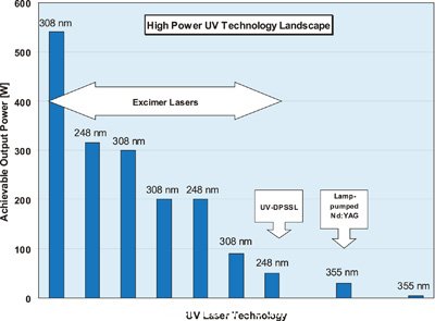 圖3. 各種高功率準分子激光器的輸出功率水平與基于全固態(tài)的355nm激光技術比較,圖中給出了308nm和248nm波長的準分子激光情況。