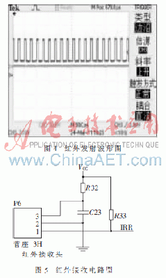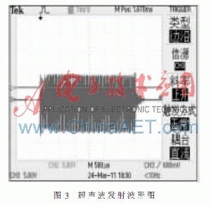 在超聲波測(cè)距系統(tǒng)中, 40 kHz的超聲波信號(hào)是最理想的信號(hào),而紅外的最佳頻率為38 kHz。其硬件組成電路如圖2所示。在超聲波發(fā)射電路中,由R4、C9和D1構(gòu)成D-R-C吸收電路來(lái)保證三極管Q1能夠穩(wěn)定可靠地工作,而不會(huì)損壞。紅外的38 kHz和超聲波的40 kHz頻率的方波由STM8單片機(jī)的定時(shí)器產(chǎn)生。圖3為超聲波電路中L2和超聲波探頭P1以及C10共振的波形圖,衰減了10倍。圖4為紅外發(fā)射波形圖。