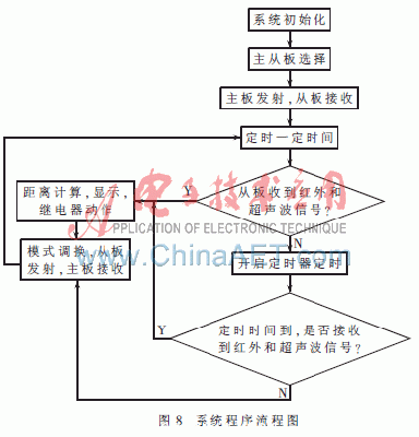 STM8單片機(jī)控制器主要完成紅外和超聲波的中斷響應(yīng)、發(fā)射定時(shí)以及產(chǎn)生38 kHz和40 kHz的方波來(lái)驅(qū)動(dòng)各自的三極管以及紅外與超聲波接收信號(hào)的濾波、數(shù)據(jù)處理、距離計(jì)算和實(shí)測(cè)距離的顯示。系統(tǒng)程序流程如圖8所示。