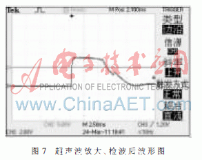 圖7為超聲波接收端波形放大及經(jīng)典的二極管檢波電路之后輸出的超聲波接收端信號(hào)波形,其通過(guò)比較器輸入到STM8單片機(jī)的另一個(gè)捕獲引腳來(lái)控制定時(shí)器的停止。