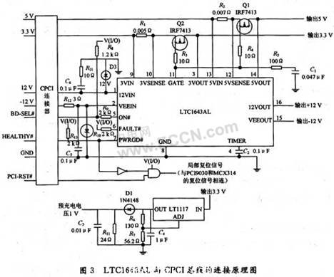 為了使板卡在熱插拔的過程中,不對CPCI總線產(chǎn)生沖擊,不影響CPCI總線上數(shù)據(jù)的傳輸,則需要一個良好的電源切換控制電路。這里選用LTC1643AL實現(xiàn)這一功能。LTC1643AL與CPCI總線的連接原理圖如圖3所示。