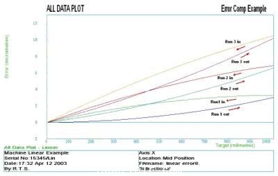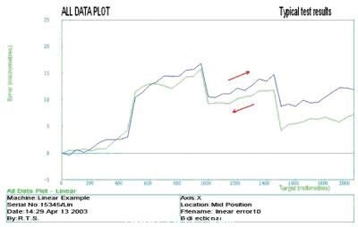 為保證測試的精確度,建議在開始校準(zhǔn)之前要讓機床完全預(yù)熱。在圖3中,安裝滾珠絲杠的端部可能正好與行程起始點重合,并且可在另一端產(chǎn)生軸向浮動。假如滾珠絲杠在對端受到限制,圖形將顯示負(fù)坡度。