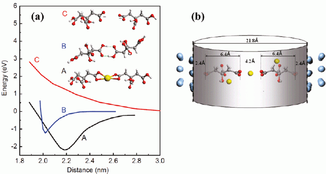圖三:形成納米孔的分子水平微觀物理機(jī)制,左圖為能量極小值,右圖為分子大小與孔直徑關(guān)系。