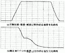 還有些機(jī)器數(shù)需要按位設(shè)置,如SP097,該參數(shù)按2進(jìn)制共有16位,從第0位到第F位,其中第1位與第0位的組合表示準(zhǔn)停旋轉(zhuǎn)方向,置01選擇正方向準(zhǔn)停;第3位置1表示準(zhǔn)停伺服期間主軸鎖定;第5位選擇編碼器檢測(cè)極性,置0;如其余位暫置為0,則SP097=0009H。參數(shù)整定后的加工中心主軸速度實(shí)測(cè)曲線如圖4所示。圖4a為主軸加速-穩(wěn)速(至1000r/min)-減速過程的動(dòng)態(tài)速度變化曲線,速度上升時(shí)間約為0.2s,超調(diào)量小于0.25%;圖4b為主軸從1000r/min的穩(wěn)定速度作定角度停止時(shí)的動(dòng)態(tài)速度變化曲線,曲線中間的恒速段為位置回路控制速度,標(biāo)志著主軸從速度控制模式變?yōu)槲恢每刂颇J?,主軸在正常運(yùn)行速度下從準(zhǔn)停命令發(fā)出至準(zhǔn)停定位完畢約需要0.5s,過渡過程平穩(wěn)。主軸靜態(tài)性能為調(diào)速范圍達(dá)到3000∶10,無(wú)靜差。