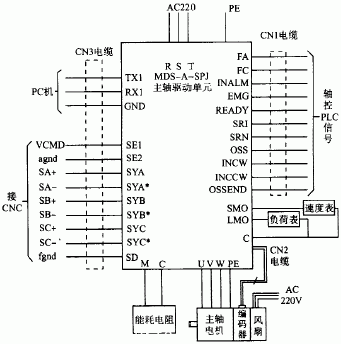 圖3為主軸驅(qū)動(dòng)系統(tǒng)的連接電路。MDS-A-SPJA系列主軸驅(qū)動(dòng)器上共有9個(gè)強(qiáng)電接線端子和3個(gè)信號(hào)電纜插座CN1,CN2,CN3。9個(gè)強(qiáng)電接線端子分別為:AC 220V三相電源進(jìn)線R,S,T,...