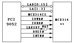 PCI9052 是PLX公司為擴展適配板卡推出的一款高性能、低價位的PCI總線從模式接口芯片。芯片引腳可直接與適配板卡金手指相連,它的各個引腳的名稱和功能可參考它的DATASHEET[1]。局部總線與MCX314as的數據線、地址線、控制線等相連。