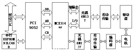 運動控制卡的硬件結構主要是由PCI接口芯片PCI9052、運動控制芯片MCX314as以及相應的光耦隔離、差動傳輸等電路組成,如圖1。其中,DB 代表數據總線,AB 代表地址總線,CB代表控制總線,軸輸出為四個軸的輸出脈沖,I/O為輸入輸出控制信號等。