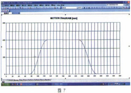 圖5~圖7所示為通過軟件制作的運動曲線,曲線中的橫坐標為主軸角度,縱坐標為從軸位置,通過不同的同步曲線實現(xiàn)了送料機構各個運動方向與壓力機的可編程運動控制。圖5為一條從軸不跟隨主軸運動的同步曲線,圖6為一條從軸跟隨主軸做先加速后勻速再減速的五次方運動曲線,圖5與圖6的可編程組合實現(xiàn)了圖7所示完整的同步運動。這條曲線就是#p#分頁標題#e#VXVY等與M之間同步運動所需要的曲線,為X、V Y、V Z、V A、V B分別編制的同步曲線如圖8所示。