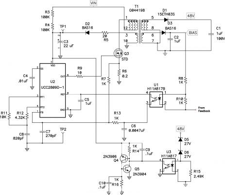 2 顯示了這種電路一個(gè)很好使用方法。圖中所示為一個(gè)高壓輸入、48-V 輸出反向轉(zhuǎn)換器,它在出現(xiàn)由控制電路故障引起的輸出過(guò)電壓狀態(tài)時(shí),利用SCR 來(lái)關(guān)閉電源。輸入電壓首次施加于電路時(shí),流經(jīng) R3R4 的電流便對(duì)大容量電容器 C3 充電。當(dāng) C3 的電壓達(dá)到足夠高時(shí),控制 IC 便開(kāi)始工作,對(duì)功率 FET Q3 進(jìn)行開(kāi)關(guān)操作,并將能量傳送給輸出端。通過(guò)控制 U1 的電流,實(shí)現(xiàn)對(duì)輸出電壓的調(diào)節(jié),從而控制通過(guò)變壓器傳輸?shù)哪芰?。這種電路還通過(guò) U3 提供隔離式過(guò)電壓保護(hù)。我們選擇使用了齊納二極管 D5D6,它們?cè)谡9ぷ髌陂g不導(dǎo)電。在出現(xiàn)過(guò)電壓的情況下,它們便開(kāi)始導(dǎo)電,壓制光耦合器 U3 的電流。U3 觸發(fā)由 Q4Q5 組成的鎖存電路。鎖存電路對(duì)偏置電容器 C3 放電,而當(dāng) VDD 電壓達(dá)到 U2 的欠壓停止點(diǎn)時(shí) U2 停止工作。